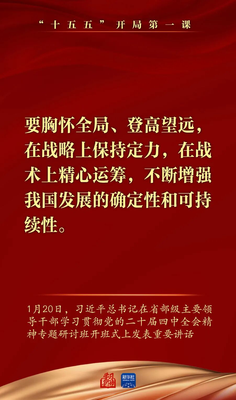1月20日,省部级主要领导干部学习贯彻党的二十届四中全会精神专题研讨班在中央党校(国家行政学院)开班。习近平总书记在开班式上发表重要讲话强调,深入学习贯彻党的二十届四中全会精神,努力实现“十五五”良好开局。总书记讲话要点,一起学习领悟。